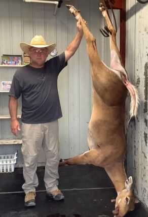I quickly got up and went to look for blood where she ran into the brush. As I was getting to the last marked spot where she ran in. I saw her kick as she lay on the ground just inside cover. I eased up from behind her, found a small stick, and gently touched her eye to verify death. The kick was a death throes involuntary spasm. She laid with her left side exposed clearly showing the two entry holes from the 444. I rolled her over to check for exits, but there were none. A small lump just beside her front leg would later prove to be the second bullet from the raking shot.