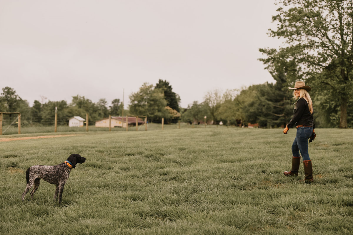 When moving to field drills and covering more ground, quartering drills reinforce “go with you”. Walking in a zig-zag pattern using the 20-foot check cord, you teach your dog to go with you in spaces that offer a lot of distraction.