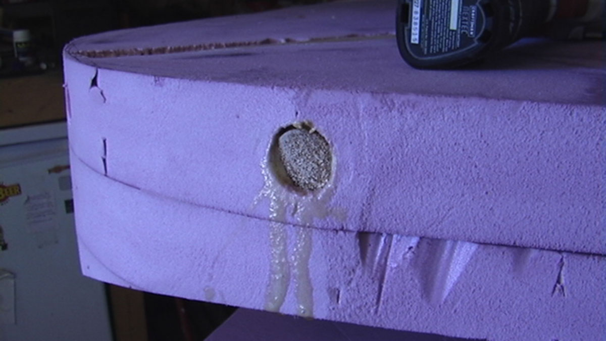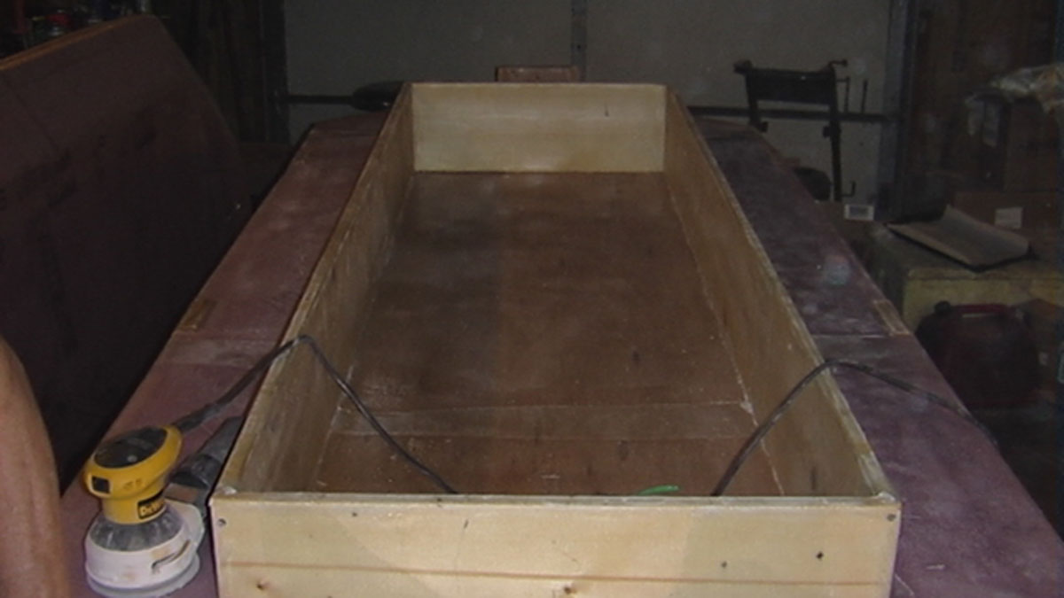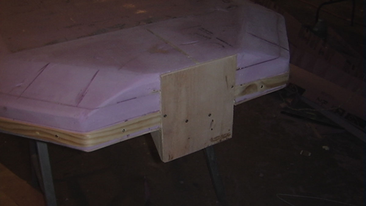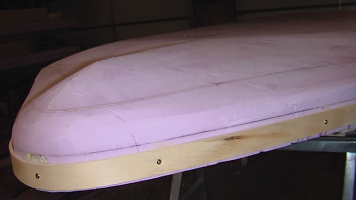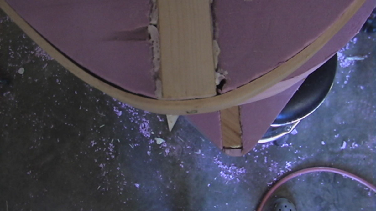 You should be ready now to begin sculpting the bottom, bow and stern section. The best thing to use is a rasp and sander with heavy paper. You will get foam all over the place, but you can easily get the shape you want. Fill any gaps with expandable foam spray.