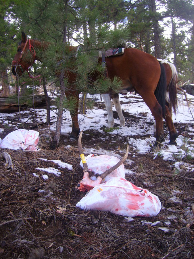 Another option that comes into play is to quarter the animal, leaving just the rib cage and entrails behind. This is a great way to transport meat if you have pack animals or a game cart. I have quartered mature elk and taken all of the meat in one trip with a person on either end of the cart. Leaving the bone in the quarters provides some rigidity to the load when you have plenty of muscle to handle it.