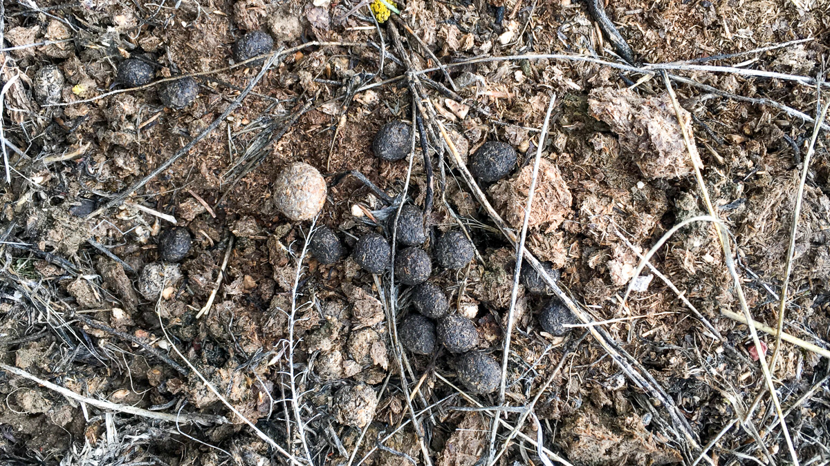 These little dark pellets are a sure sign that cottontails inhabit this area; the larger tan pellet is from a jackrabbit. The small pellets are about the size of the nail on my pinky, while the jackrabbit scat is as large as the nail on my thumb.