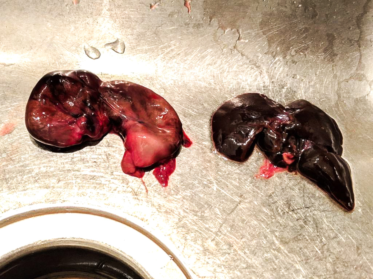 The rabbit’s liver will tell you if it was a healthy critter. The liver on the right is normal. The one on the left is mushy and discolored and engorged. I’d pass.