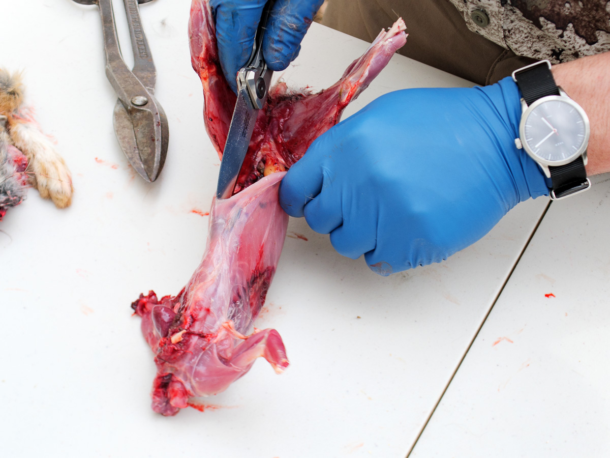 Use heavy scissors to remove the head and feet. Tin snips work like a charm. Gardening shears are also terrific. This rabbit lost a shoulder to a bullet.
