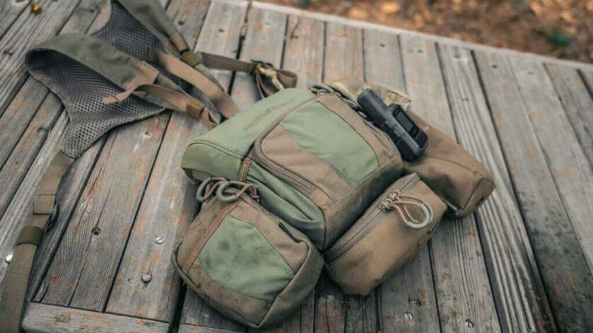 - Chest Harness: Eberlestock Recon chest pack for binoculars