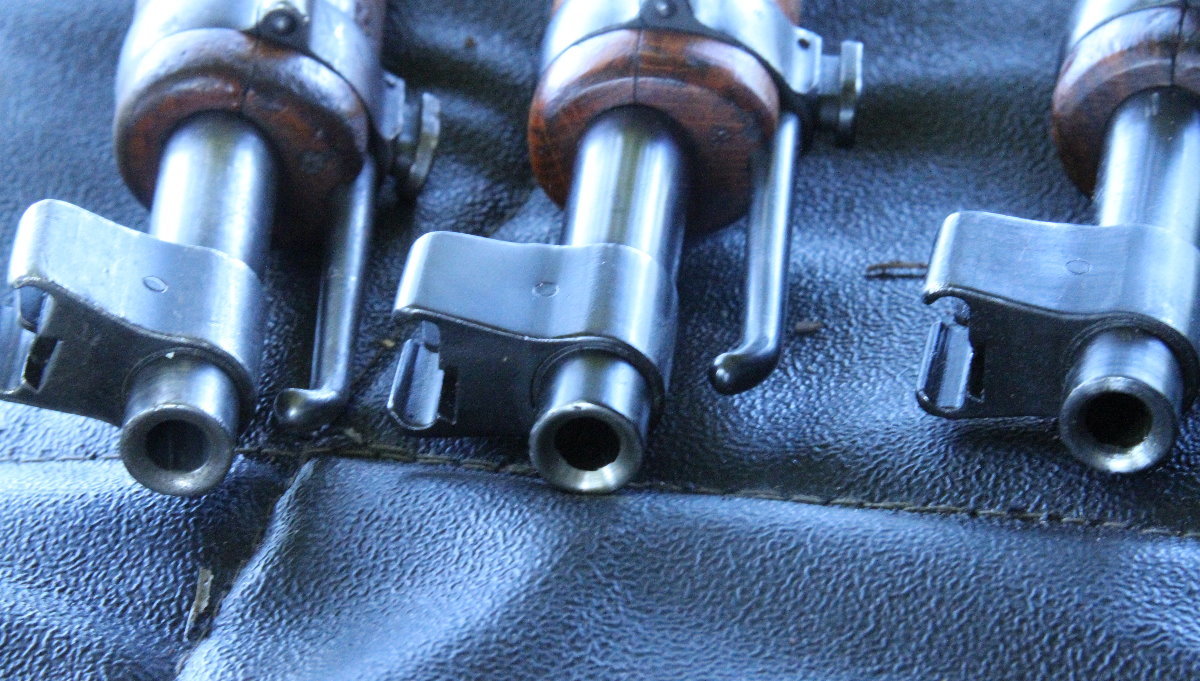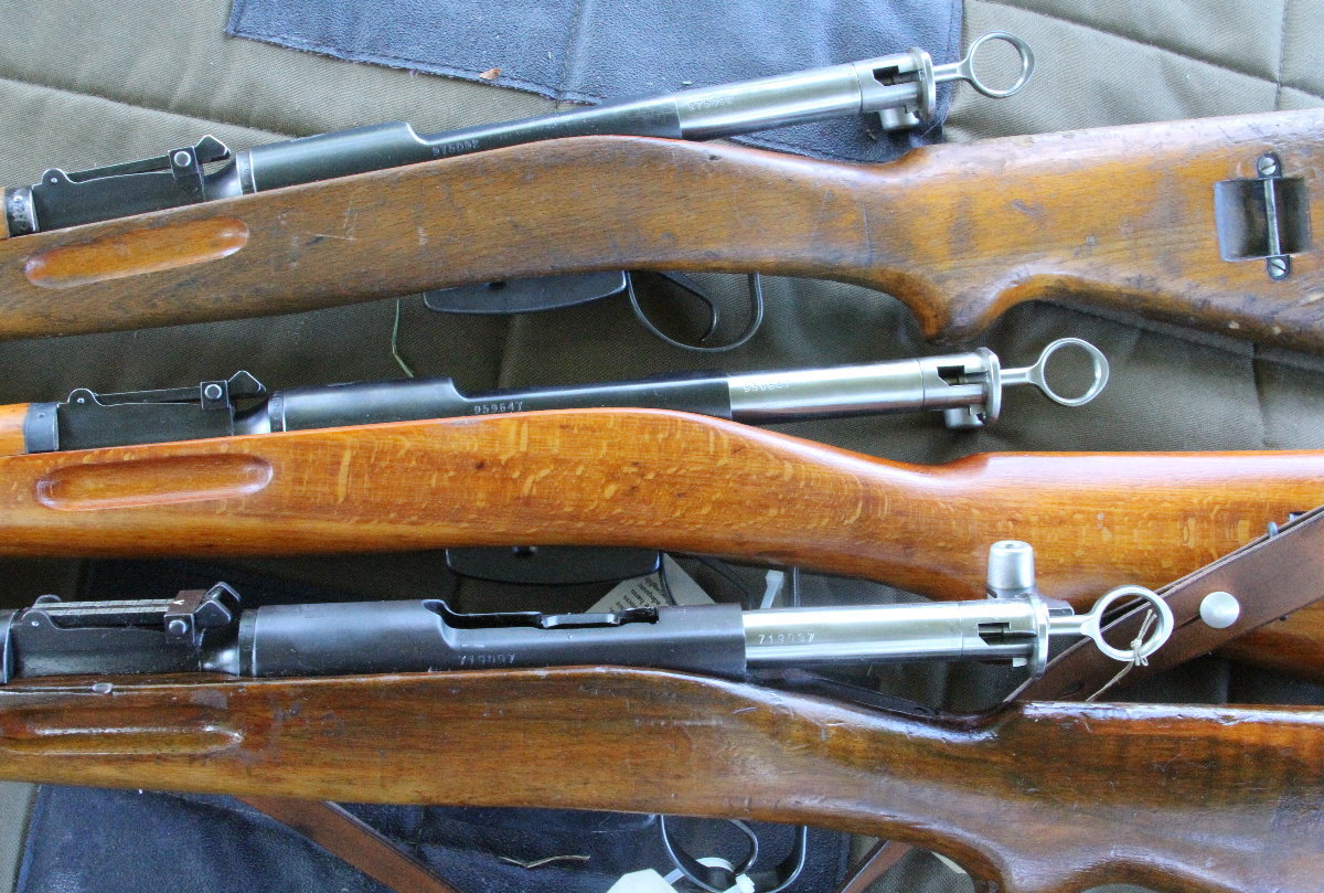 The top rifle is the old gun. The beech stocks on many of the old guns have worn away for some reason. The second gun is the new unissued beech rifles, and the bottom is the walnut stock.
