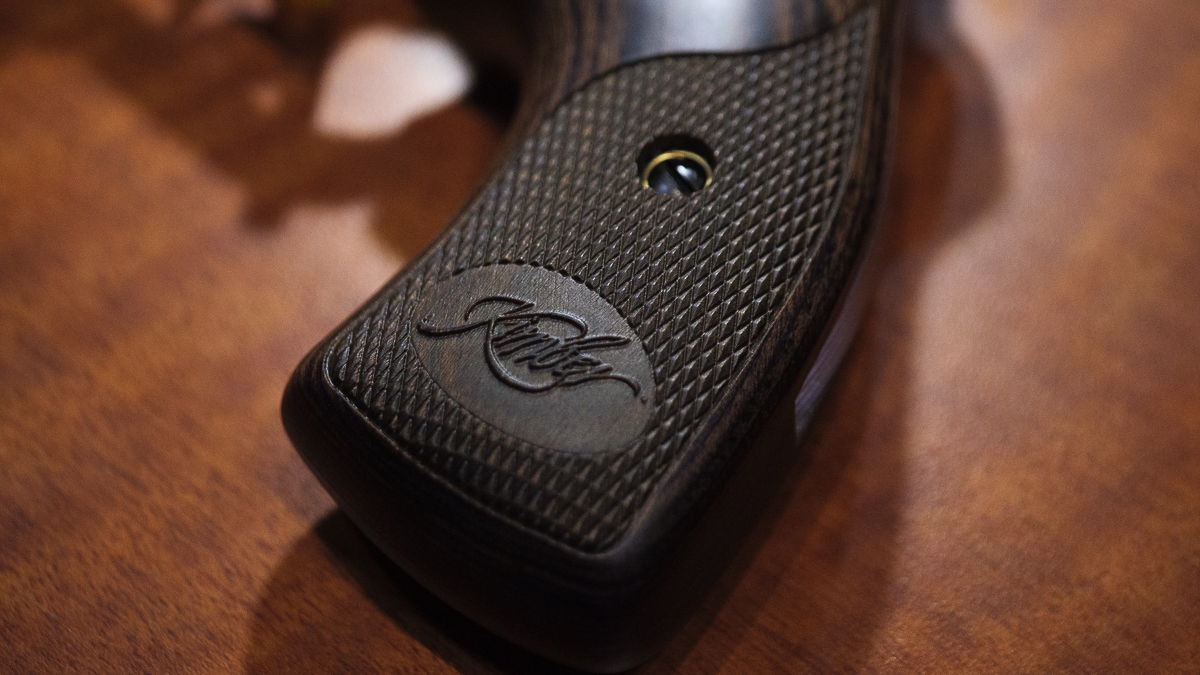 - Walnut checkered grips with Kimber logo.