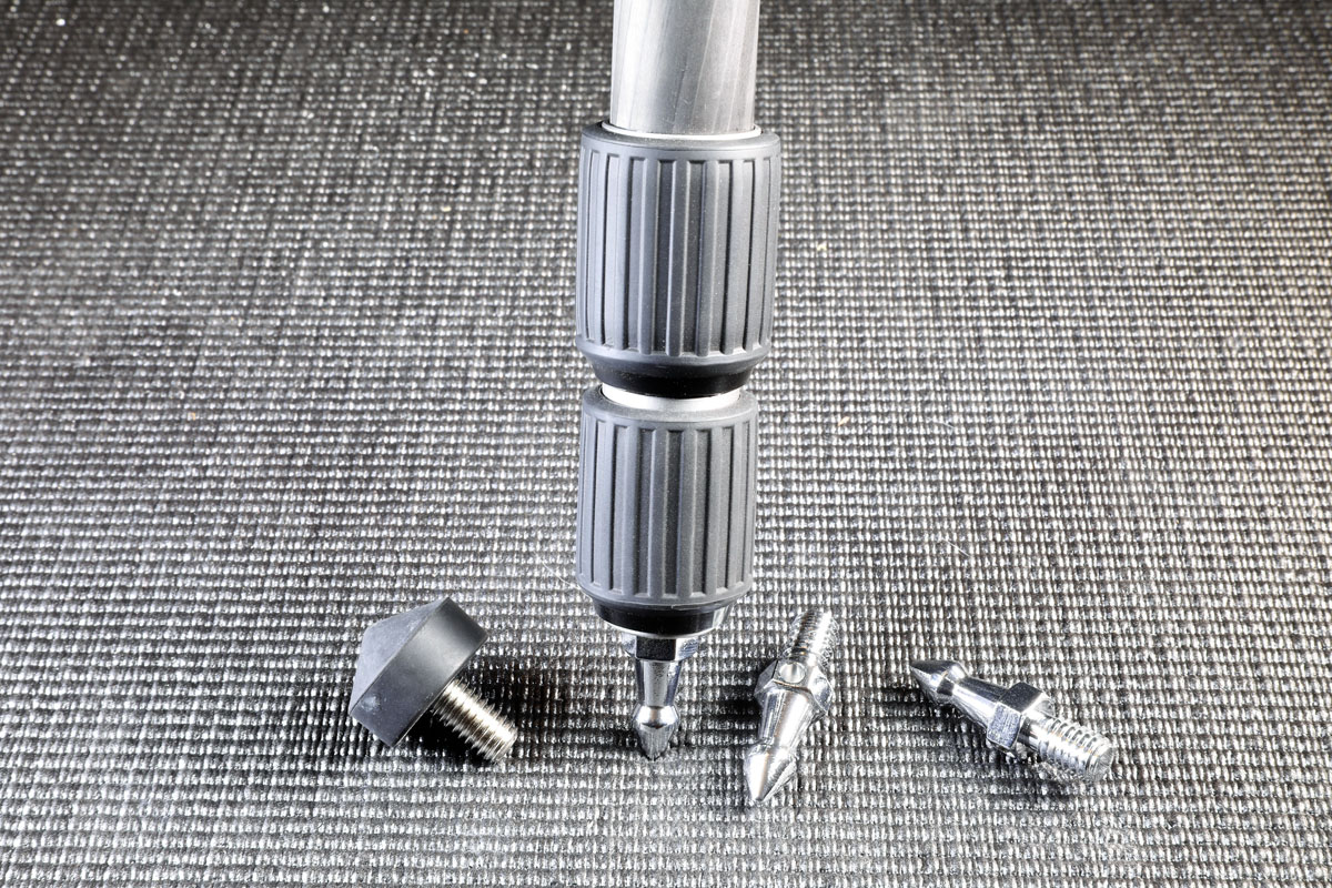The tripod comes with rubber feet as well as spiked feet. The rubberized adjustment knobs are strong and quiet.