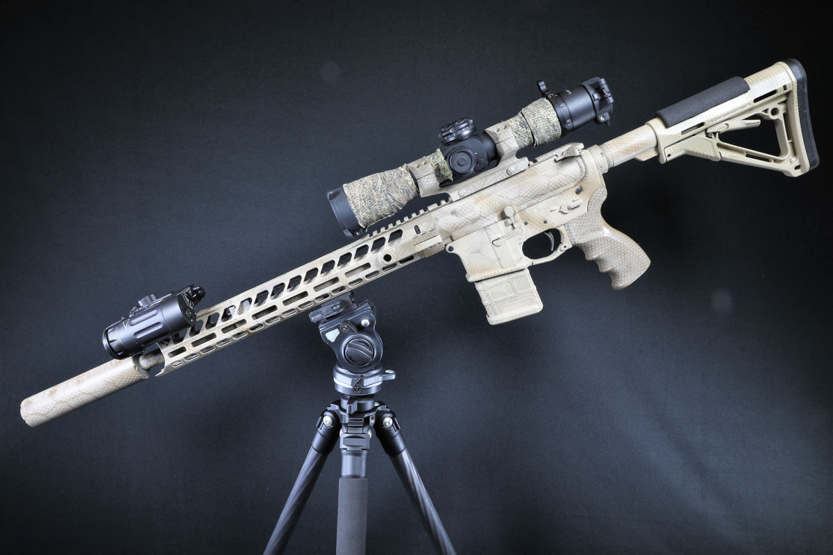 My current predator night hunting rig (above) is the same as my daytime coyote rifle–a Cerakoted gas rifle chambered in .223 Wylde, with a US Optics B-10 scope in a Warne scope mount. For a variety of reasons (another article) I shoot suppressed and use the Hurricane Ti by Doug Melton at SRT. This set up has been sub-MOA for many years. For night hunting I add a Steiner D2 Dual Beam Aiming Laser/Illuminator. The D2 is an impressive unit, with an outstanding return to zero when attaching and detaching (I remove the D2 for day use). Helmet mounted twin PVS-14 night vision completes the night hunting package.