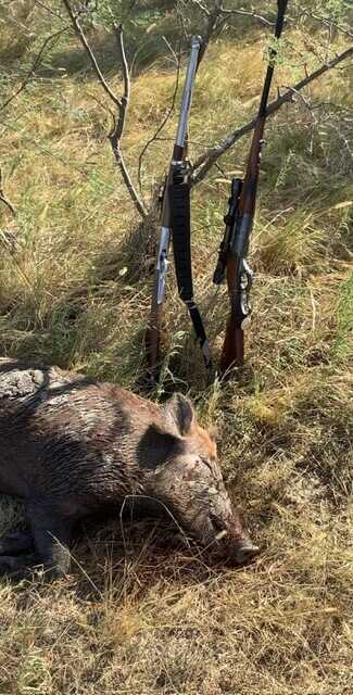 While scouting the ranch, I kept the Savage handy. At one point, we drove up to a water hole where cattle rested on the shady side. As we eased through, we spotted a herd of feral pigs asleep in the mud on the opposite side. A single pig didn’t wake as his herd scattered. The Savage 99 delivered a precise shot with a 100-grain Core-Lokt SP just behind the pig’s right eye from 160 yards.