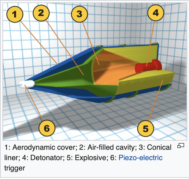 A shaped charge is a form of explosive lens wherein the kinetic energy from a high explosive charge is focused onto a single point. This allows a relatively lightweight warhead to punch through a substantial thickness of armor plate. The armor-piercing capability of a shaped charge is generally about seven times its diameter.