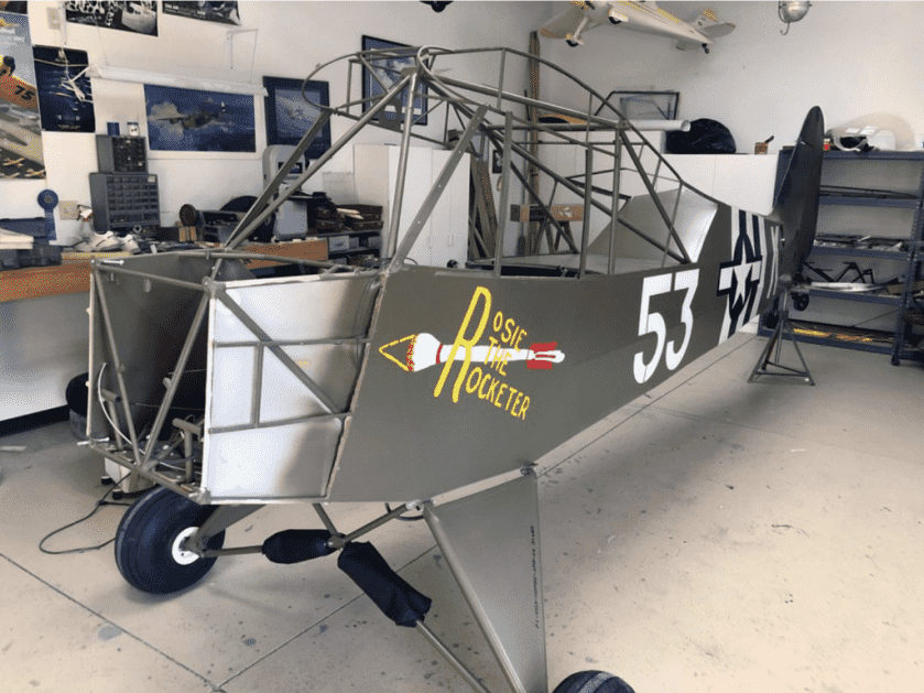 Powers found a double patch on the front strut from combat damage as well. Once the restoration was complete Charles Carpenter’s granddaughter, herself a graphic designer, painstakingly reproduced the “Rosie the Rocketer” nose art. Now in flyable condition, “Rosie the Rocketer” can be seen at the Collings Foundation Museum in Massachusetts today.
