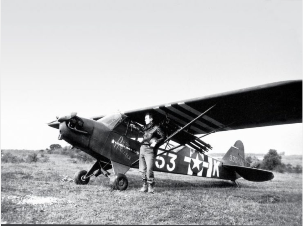 The L-4H was a reconnaissance aircraft pure and simple. Its mission was to zip ahead of American armored columns at low levels and report enemy troop dispositions. Grasshopper pilots also trained as artillery spotters. Early on German forces assiduously avoided engaging the Grasshoppers for fear of drawing undue attention from Allied artillery or close air support. Charles Carpenter was having none of that.