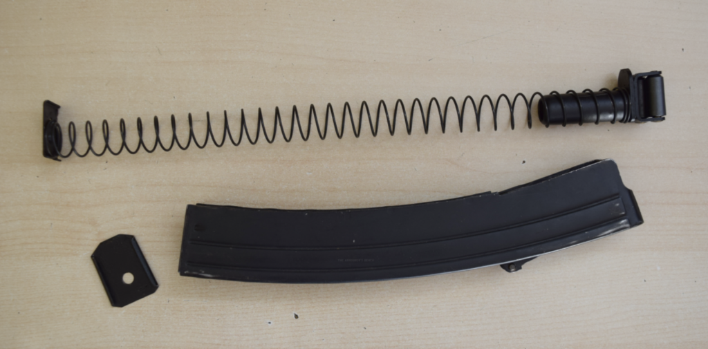 The curved double column, double-feed magazine of the Patchett gun featured a novel follower made of roller bearings and was likely the best submachine gun magazine ever devised. These boxes carried 34 rounds and were easy to orient in the dark. As magazine supply could have been an iffy thing in the latter parts of WW2, the Patchett was designed to accept either Sten or Patchett mags seamlessly.