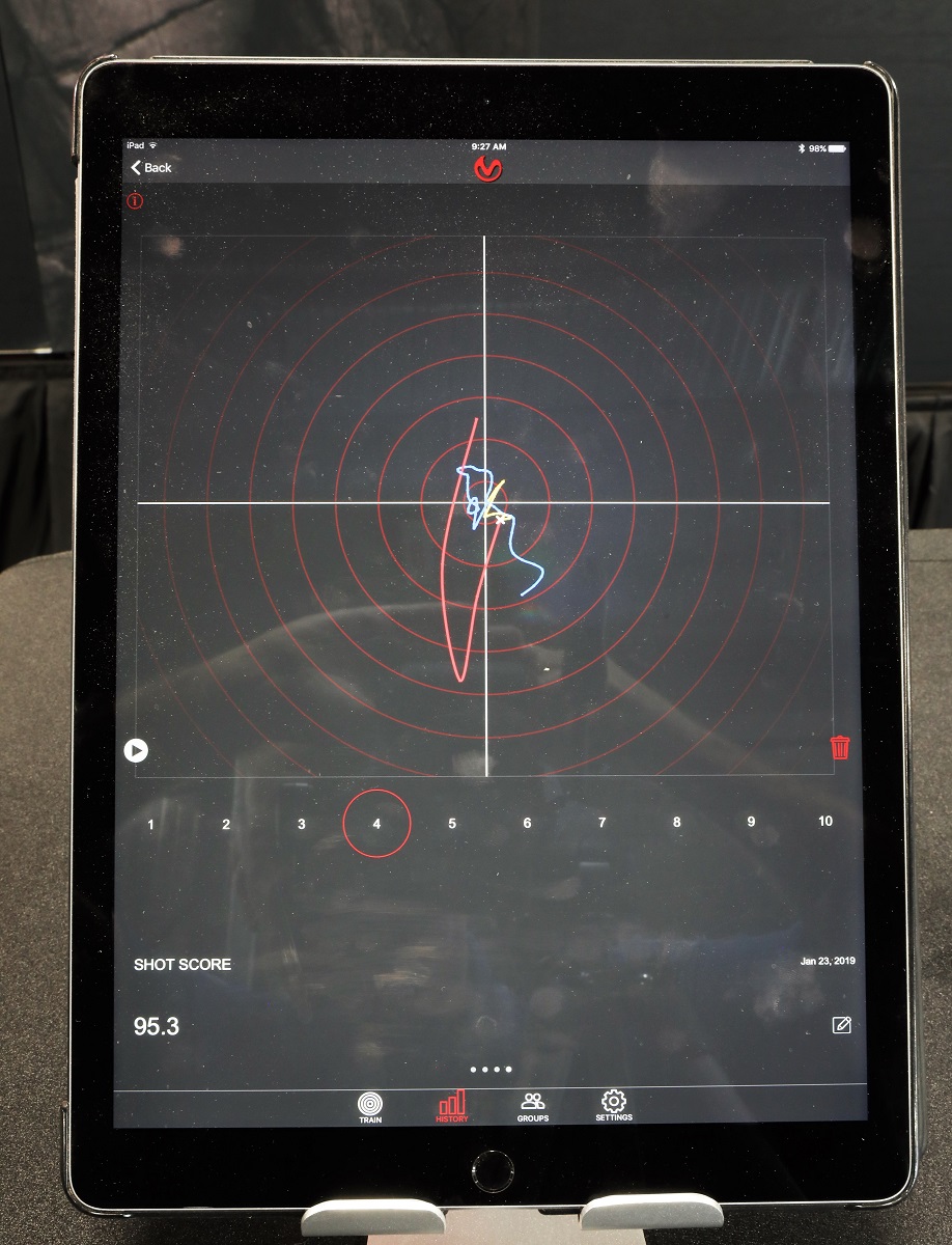 A few years ago MantisX introduced their firearms training system with a rail mounted module that tracks the shooter’s movement before the trigger is pulled. The unit sends data to your smart phone or tablet to display visual and quantitative feedback regarding what was going on just before the trigger pull. The system can be used with any firearm that has a standard rail, and it can be used for either dry fire or live fire. For each shot the shooter gets a score based on how still the gun was held before the shot. There is also a visual that traces the movement of the gun.