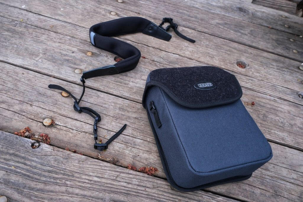 The Optika’s come with lens covers/guards, a neck strap, and a cloth carrying case.
