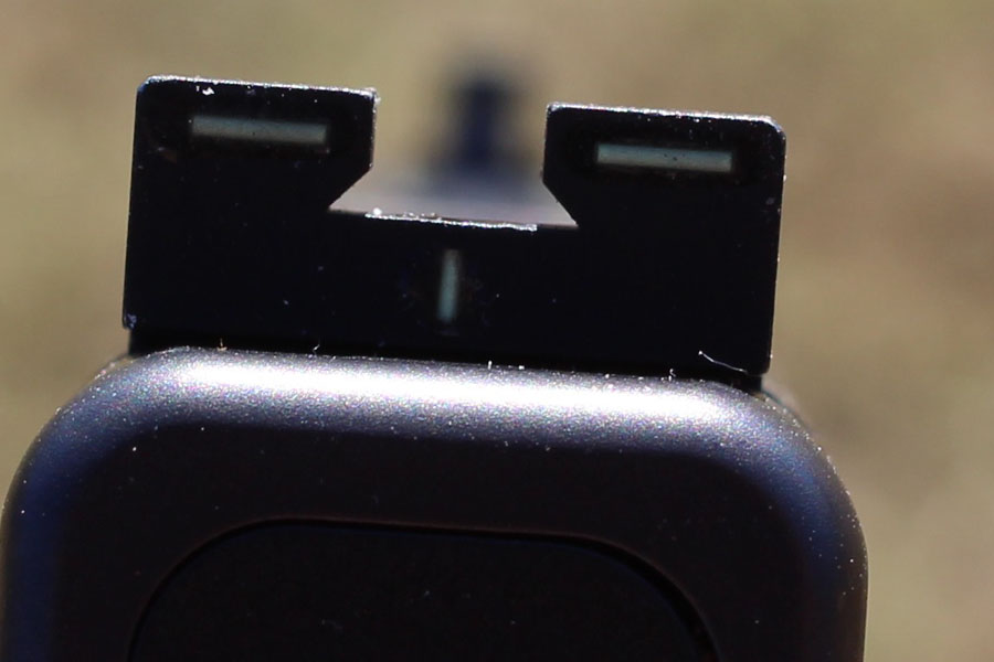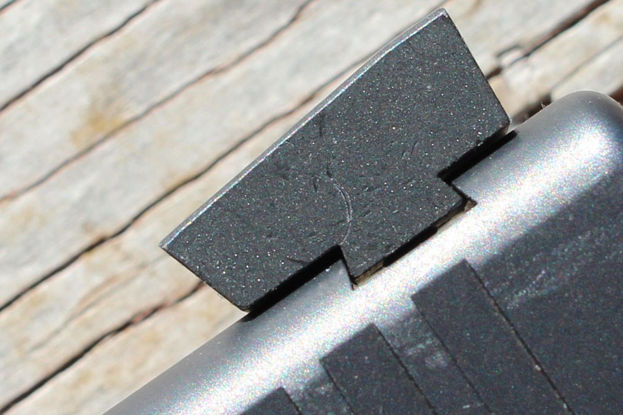But these take that to the next level. The slope isn’t perfectly perpendicular along a 90 degree line. Instead, they can’t slightly forward. That allows the vertical edge to be more of a hook. And the front sight has it, too. This one leans slightly forward. While it may increase the chances of you pushing the slide out of battery if you are firing from inside a coat or a bag (as we demonstrated here in this test), it provides more opportunities for improvisational manipulation.