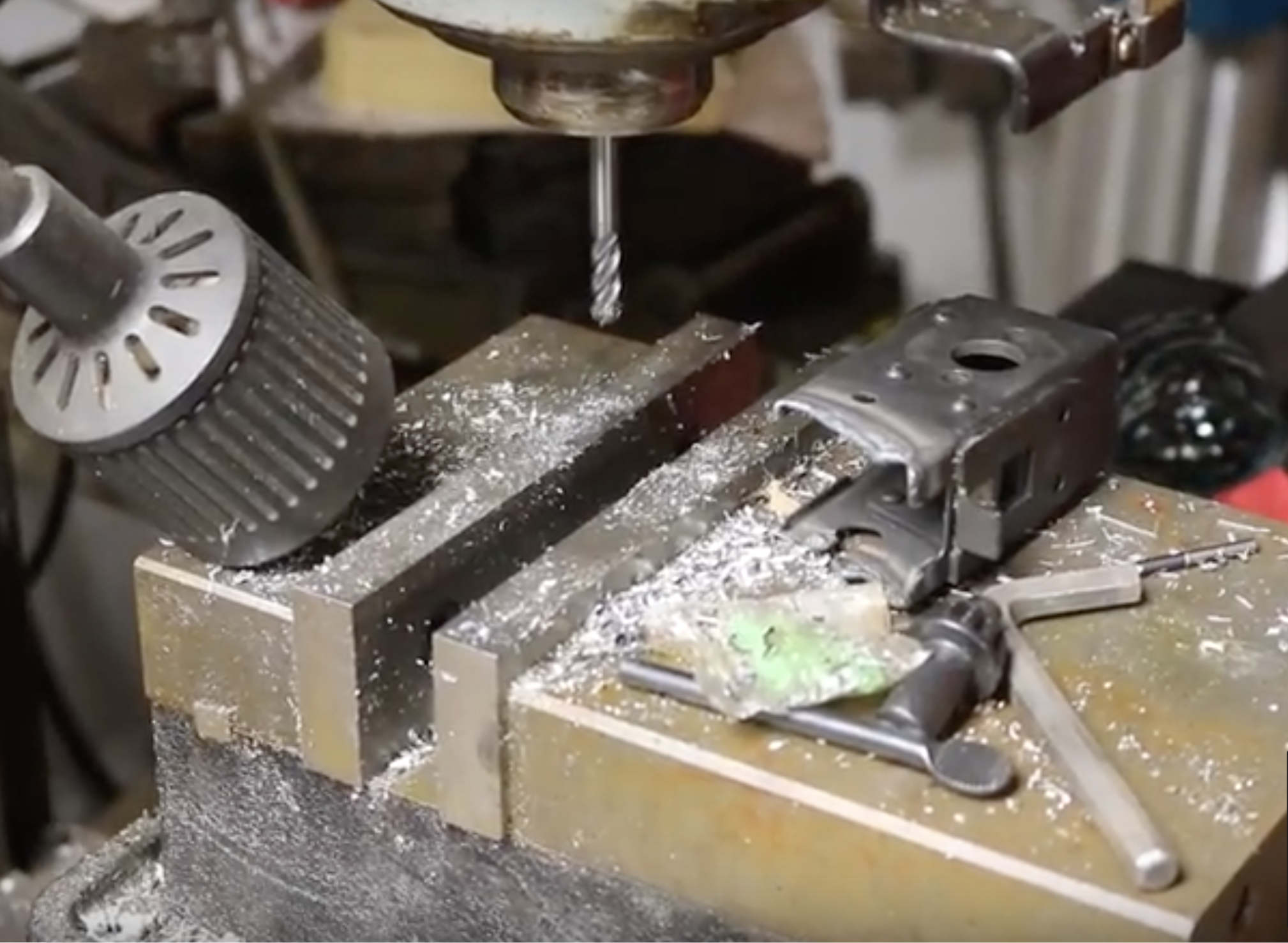 The author used a milling machine in the garage for the first step, removing the remnants of the old receiver (the old rivets). You could also do this step with a grinder or a hand file if you’re ambitious.