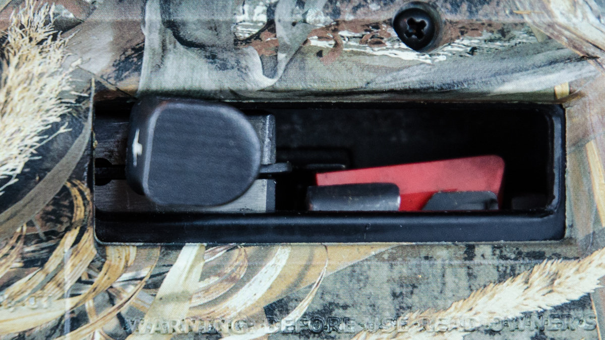 • Safety: This is the old-fashioned button-style safety—push it in from one side to engage the safety and prevent the trigger from operating; push it in from the opposite side to disengage the safety and make the gun ready to fire. One side (left) is marked with red to indicate “safety off” when it is extended. This is a fairly common practice, and I like to think of it as “red = ready” and teach youngsters that phrase.