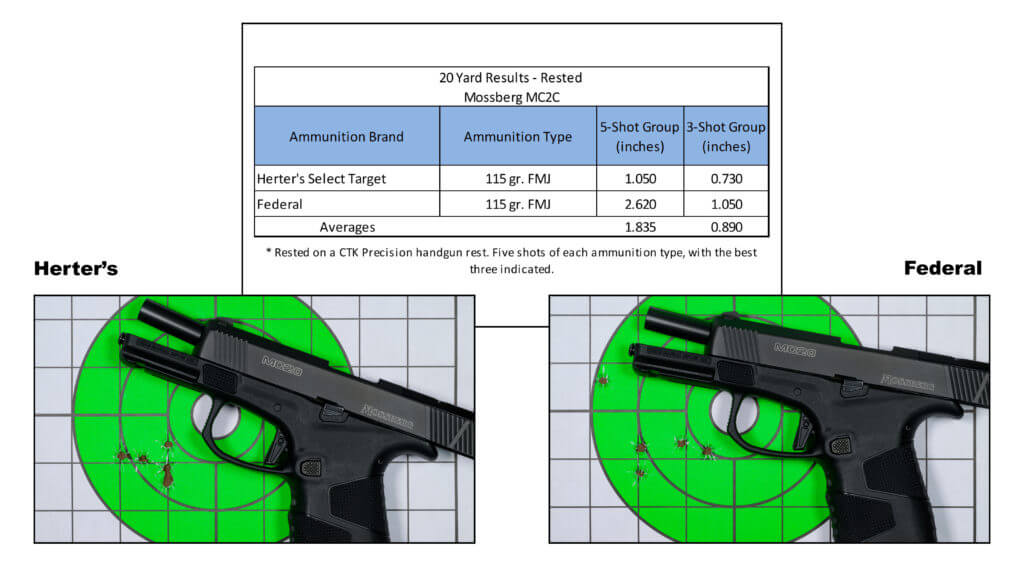 To get a better feel of the accuracy I could produce with the Mossberg, I chose two garden variety 9mm loads to shoot from a rest at 20 yards – again, using the open sights. The results were pleasing for both groups, but one group was much better than the other – to which I will credit the Herter’s ammunition.