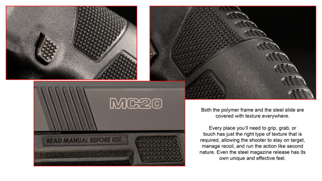 The MC2C feels great in the hand – at least in my hand. I have medium-sized hands and the fit is very comfortable and familiar. In a standard grip, my right thumb overlaps my middle finger almost to the first knuckle. The thinness of the frame combined with the grip angle and aggressive distance between the web of the hand and trigger makes it easy to reach and manage all the controls without modifying one’s grip.