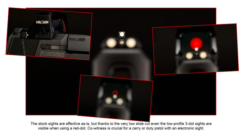 To guide you toward that accuracy, Mossberg has equipped the MC2C with a set of 3-dot white sights. There is not much to say about the sights, aside from them being functional. Upgrades to night sights are also available. However, where Mossberg did its homework here was to cut the optic mount so low that most compatible optics will easily co-witness with the stock sights. For a carry or duty pistol, this is an important point. I mounted the Holosun HS507K micro red-dot optic on the pistol and was extremely pleased to see that both the projected reticle and white dots are visible through its small window. This is made especially impressive considering how low and snag-free the sights are.