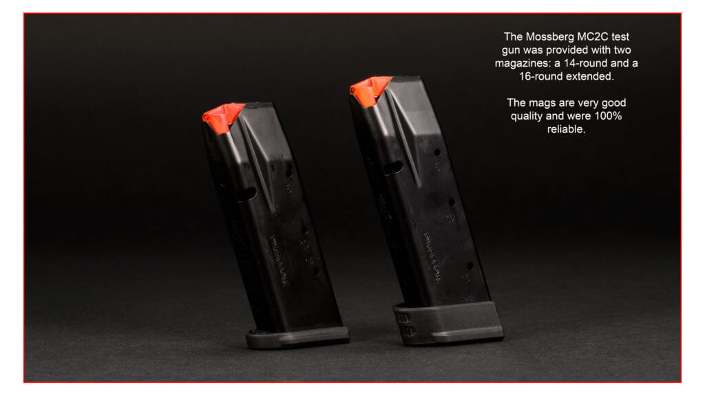 The MC2C ships with one 14 round and one 16 round magazine, where that is not infringing on local laws. Otherwise, 10-round mags are the standard fare. Industry practice for this size gun would typically suggest 15 and 17 round mags respectively, but it seems that Mossberg felt that keeping the height down was more important, and I can’t find fault with that. If you carry on or around your 4 o’clock position you know that dimension is critical when it comes to avoiding printing.