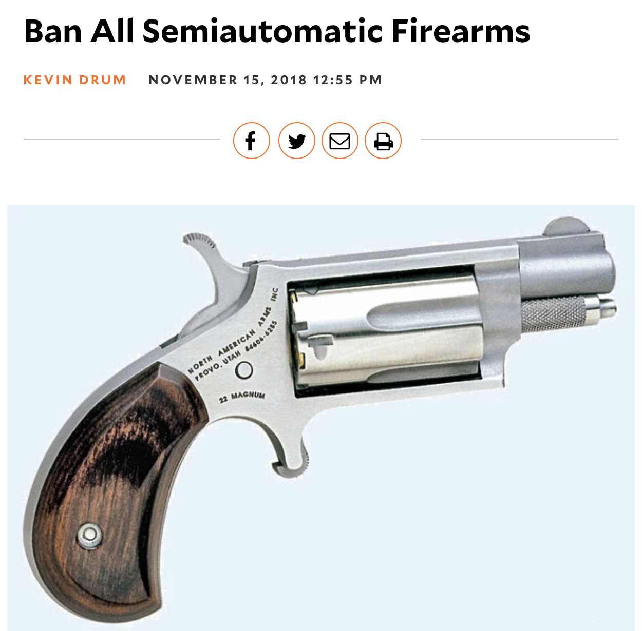 “I would ban all semiautomatics,” wrote Drum in a recent article. “That would leave the gun owners of America with three types of weapons they could legally own: single-action revolvers, shotguns, bolt-action/pump-action rifles.”