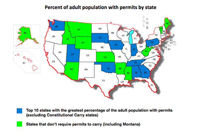 • In ten states, more than 10% of adults have concealed handgun permits. Indiana has the highest rate — 15%. South Dakota is close behind with 14.7%.