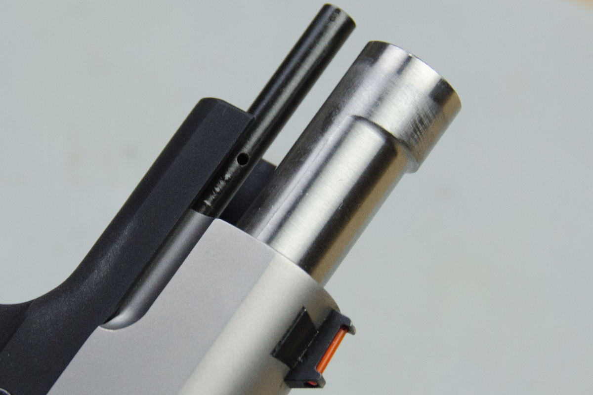 The Concealed Carry Contour EMP has a bushingless bull barrel that mates directly to the slide. It also features a guide rod.