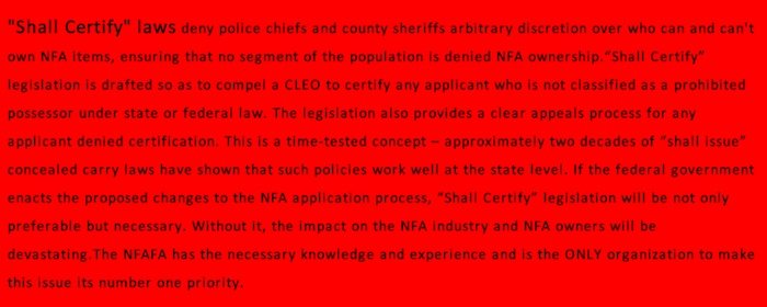S.H. Blannelberry: “Shall Certify” is a great cause, but how realistic is it to think that all 50 states would at some point adopt shall certify legislation with respect to NFA items (I suppose the same could have been said with respect to CCW laws 30 years ago)?