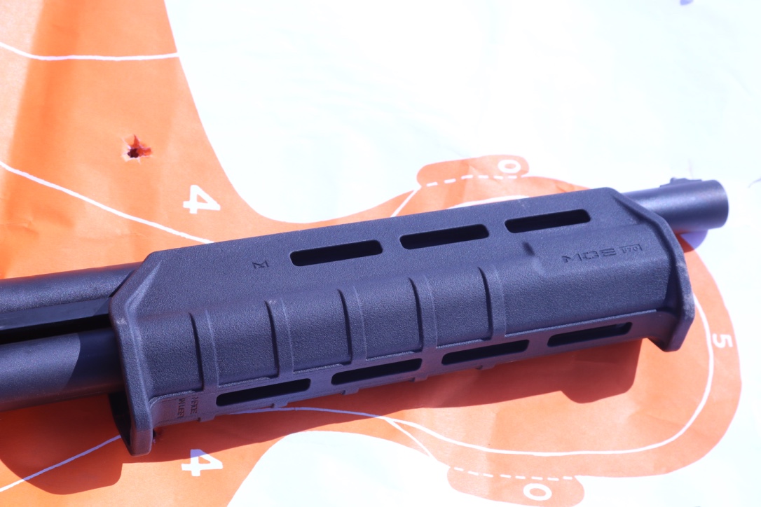 How about the gun jumping out of your hand under recoil? Happily, this is not much of a problem with the 20 gauge. But I have a couple of rounds under my belt with these. The question is, under recoil, can your hand get in front of the barrel before the shot column passes the crown? I, for one, kind of doubt it. My degree in physics hasn’t shown up in the mail yet, but let’s think that through. Recoil starts after the gunpowder in the shell are already burning, which means the projectile is already moving. Recoil also tends to push the muzzle up, not down. Is there any human speed that can beat a shot column out of a 14-inch barrel? Highly unlikely. Also, this is a pump gun. You can’t fire another shot until you run the pump. Either way, a Magpul hand stop alleviates any doubt.