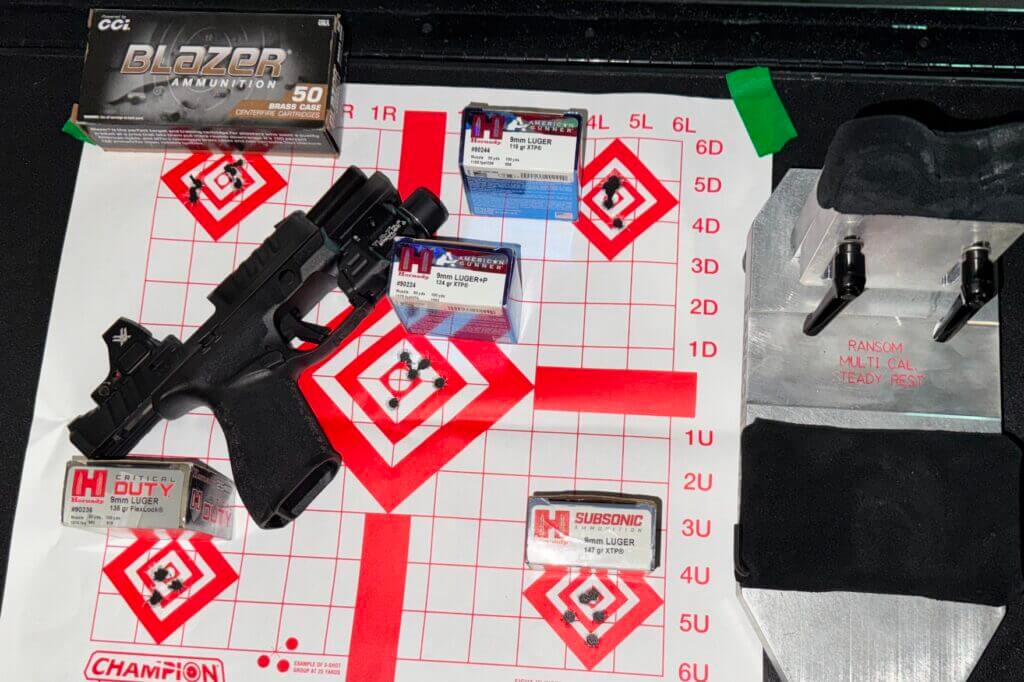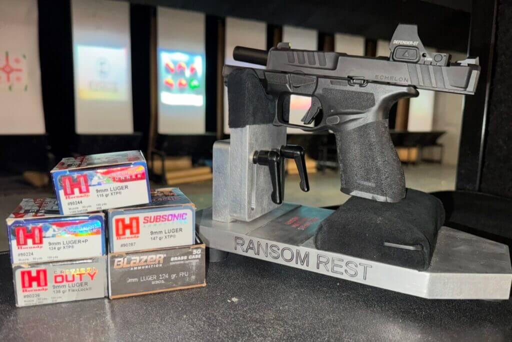 To test the precision of the Echelon 4.0C, I shot groups from 7 yards using a Ransom Rest to ensure a stable, rock-solid foundation. I ran four types of Hornady carry ammo along with 124gr Blazer Brass. Each group measured around an inch, with the best group coming in at about 1/2″ when shot with Hornady Critical Duty 135gr FlexLock. This level of accuracy is more than acceptable for a carry gun at this distance, and I found the results to be solid for its intended use. The Echelon proved itself to be reliable and precise, offering good performance for everyday carry.