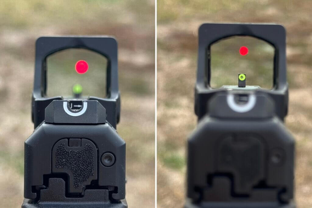 The slide also includes a deep cut for optics, which allows for a lower mount that nearly aligns the red dot with the included U-Dot rear sight and Tritium front sight for potential co-witnessing. While not quite a full co-witness, it does offer some redundancy with the iron sights in place.
