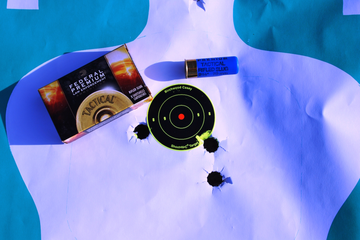 I was also interested in seeing how the barrel performed with slugs. I moved to 50 yards and shot several three-shot groups off of a range bag. My best group was shot with Federal’s Tactical 1 oz Rifled Slug. The Federal load chronographed at 1,176 fps and produced a group that measured 3.5 inches.  Remington’s 1-oz Reduced Recoil Slug chronographed at 1,117 fps and produced a group that measured 4 inches. I also used the LPA adjustable sights to shoot a group that measured 4 inches. This is outstanding accuracy from a 14-inch tube and really extends the effectiveness of the compact shotgun.