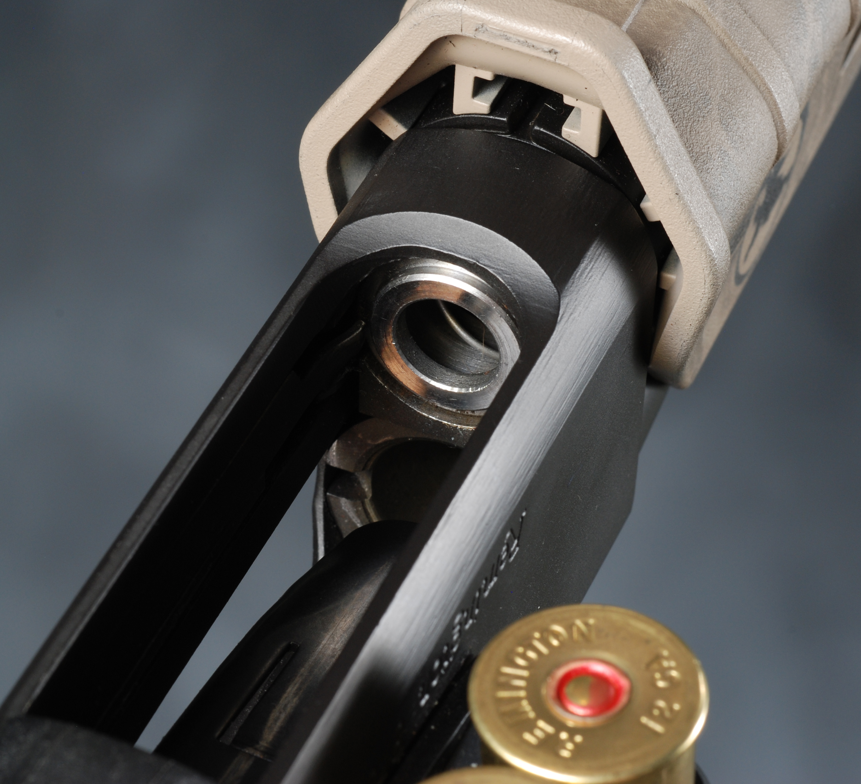 The shotgun is equipped with a four-round “sidesaddle” for carrying spare ammo within quick reach.