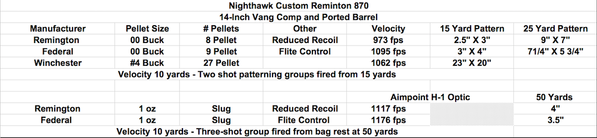 screen-shot-2016-09-12-at-1-13-49-pmThe old school, standard police load was usually 00 buck shot that consisted of nine .33 caliber pellets. However, over the years, manufacturers have improved the performance their loads through improved shot cups and other technology. In addition, they have developed specific “reduced recoil” loads for law enforcement. We tested the Nighthawk 870 with Remington’s Remington 8 Pellet Reduced Recoil load and Federal’s 8-Pellet Federal Flite Control load. The Remington load averaged 873 fps and the Federal Flite Control load averaged 1,095 fps. We patterned both loads at 15 yards and measured the height and width of the group. The Remington load measured 2.5×3 inches while the Federal load 3×4 inches. Surprisingly, at 15-yards, the Remington grouped consistently better than the Federal Flite Control. We also tested a 27-pellet Winchester #4 Buckshot load from Winchester. This load is devastating at close ranges, but at 15-yards produced a spread that measured 20×24 inches. The advantage of the #4 load is that it reduces the risk of over penetration.