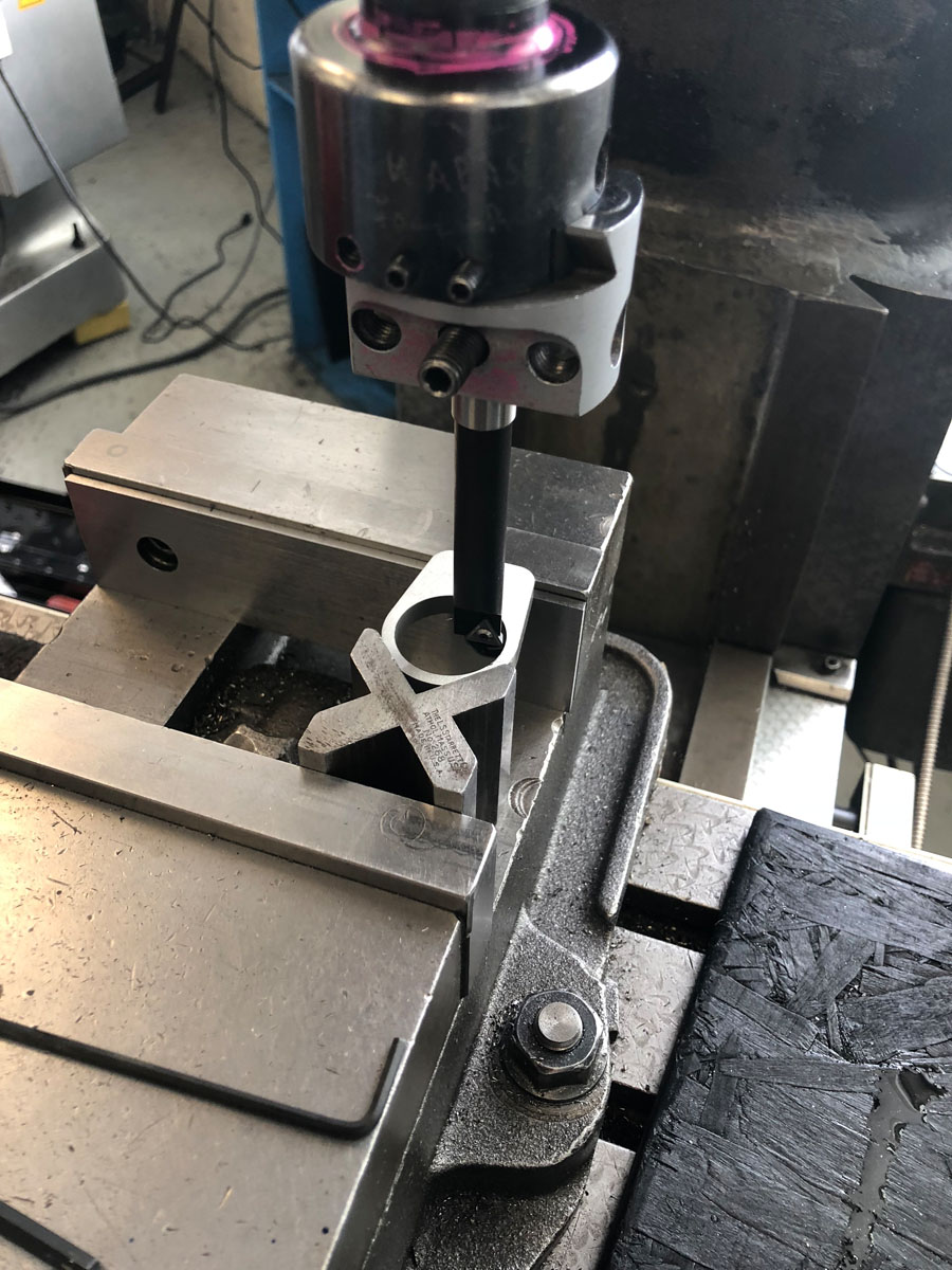 I used an offset boring head on a milling machine, but you could do this on a lathe as well. Either way, you’ll want to open it up enough to slide over the threads on the barrel. Do yourself a favor if you’re using a milling machine, set up a stop on the part. You will likely have to put it back in and open it up a little bit more, and the stop will save you from having to re-indicate the part in again to find the hole center.