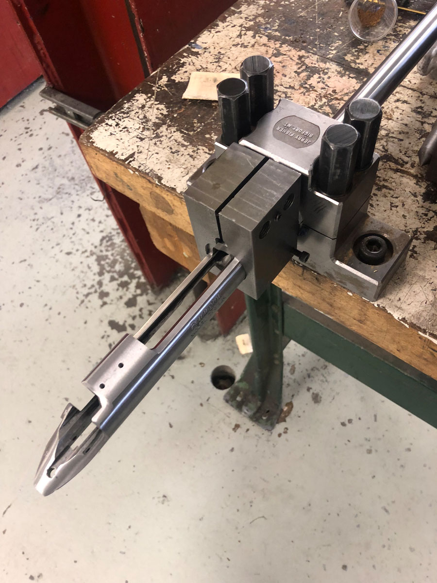 With the receiver work complete it’s time to move on to the barrel. There is more than one way to set a barrel up in a lathe. In this class we put it between centers. This ensures that the work we do will be concentric to the bore.