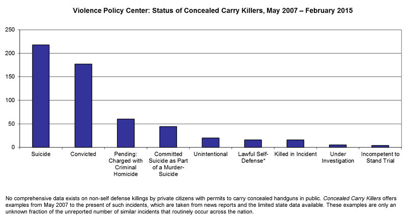 There is no central tally of the effects, with states often barring release of concealed-carry data and Congress hewing to the gun lobby’s opposition to research on guns’ effects on public health. But a methodical gleaning of eight years of news accounts by the Violence Policy Center, a gun safety group, found that in research involving 722 deaths in 544 concealed-carry shootings in 36 states and the District of Columbia, only 16 cases were eventually ruled lawful self-defense — even though this has been a major gun rights selling point for the new laws.