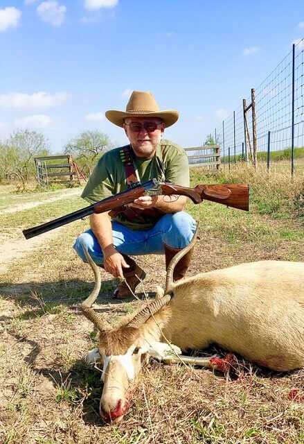 My first game taken with the Merkel double would be as memorable as the purchase of the rifle. I was on a ranch in South Texas that, among many other African species, has a pure blood strain of Scimitar horned oryx. The ranch had several Addax from a neighboring ranch break through a fence. Addax were known to breed with Oryx, and the rancher wanted them killed ASAP, before his bloodline was contaminated. Only too happy to oblige the owner, a good friend, and I happened upon two on the morning of my arrival at the ranch. It later proved to be the remaining two that had eluded previous attempts to remove them from the gene pool.