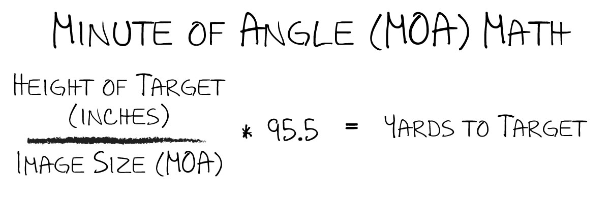 Since one of the design goals of the mil-dot system was easy range estimation, the formula is simple if you input the object size in meters or yards. If you have a scope that has a minute of angle (MOA) reticle marks, you can still range, you just need to use a different formula. The structure is the same, the constant number is just different to account for the conversion of minutes of angle.