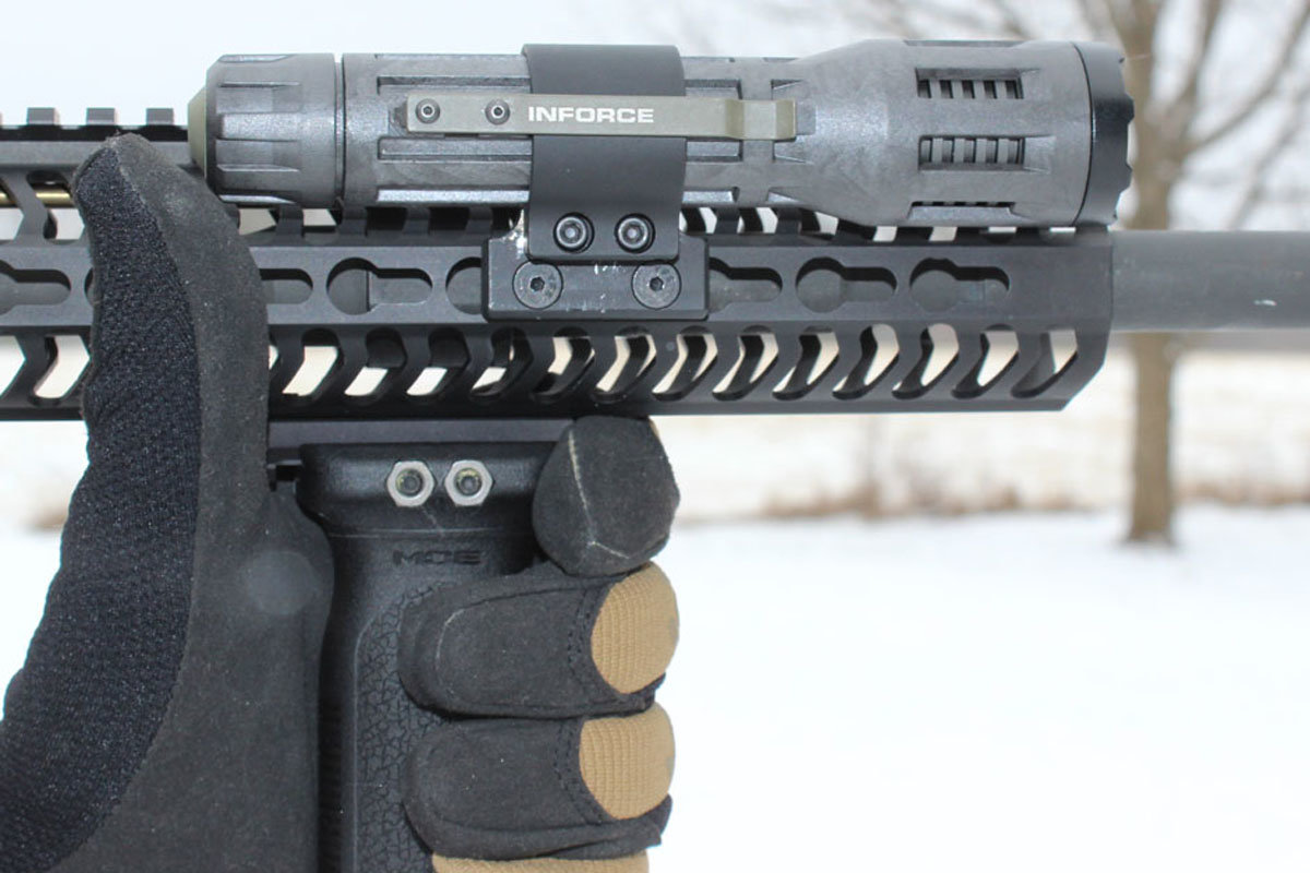 The light mount is trickier. With it in the two o’clock position, I can grab the RVG with my support hand and click the InForce 9VX’s button with my thumb, all without releasing my shooting hand’s grip. I’d rather have the light on the left side of the forend, but that interferes with my support hand’s grip. On an even longer upper, this wouldn’t be such an issue. As is, it is functional.