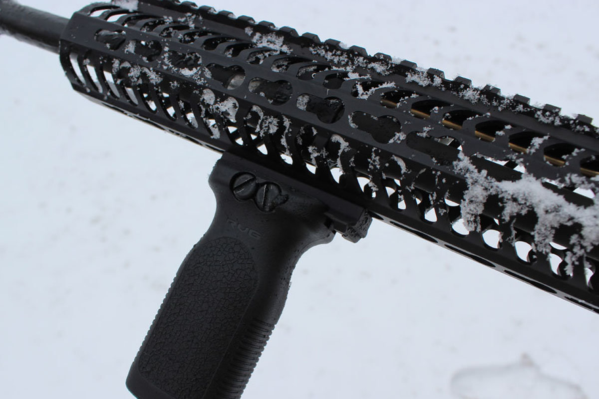 The Kmod rail greatly increases my support hand’s forward reach. The 12.5 inch tube is still not as long as I would like, but it is ideal for the 16.5 inch barrel. Any more length might put an unprotected hand in the path of venting gasses. With the Magpul VRG pulled back slightly from the front of the forend, there is just enough room for a solid grip. The RVG serves as a handle and as a stop for the back of my palm.
