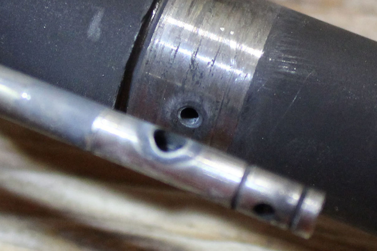- These are the holes for the pins that held on the original sight post. One will be covered by the new gas block, but the other will be exposed.