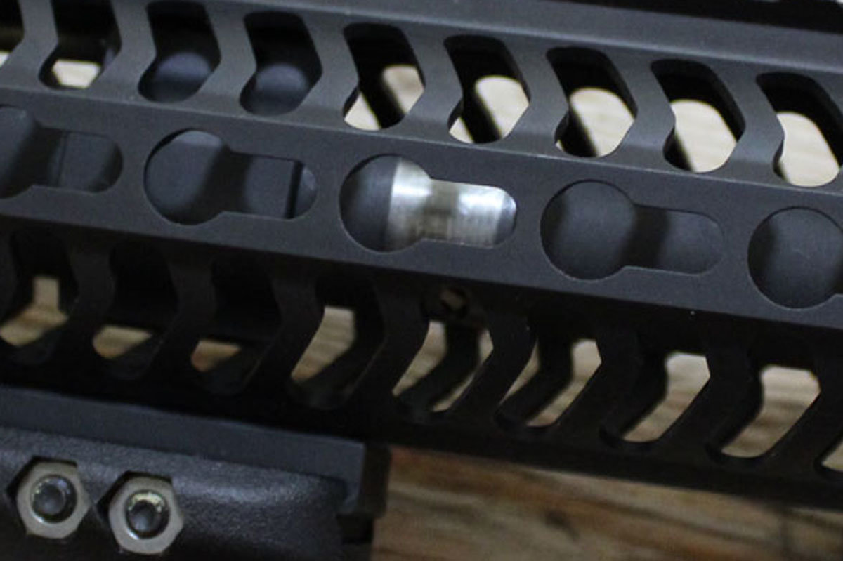 KeyMod is different. A uniquely shaped nut threads into a keyhole on the forend. On the outside, a bolt tightens the rail section (or the accessory itself) against the forend. The nut snugs up tight inside the forend. When rail sections are attached, the options are the same as they would be for any railed AR. If the attachments add on directly (with their own integrated Kmod attachment points), then the girth is cut down a bit, and the weight is reduced slightly, too.