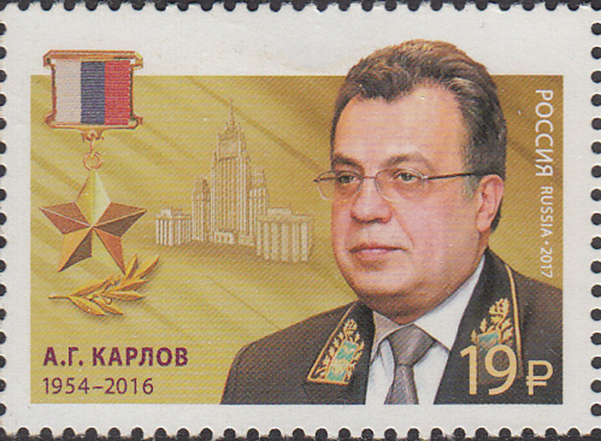 Andrei Karlov was memorialized in a variety of ways after his death. His likeness graced a series of Russian postage stamps.