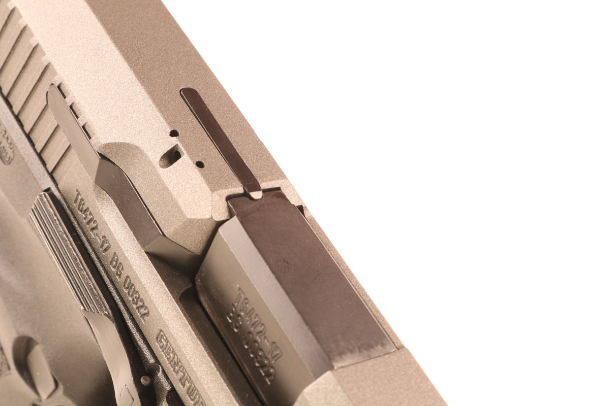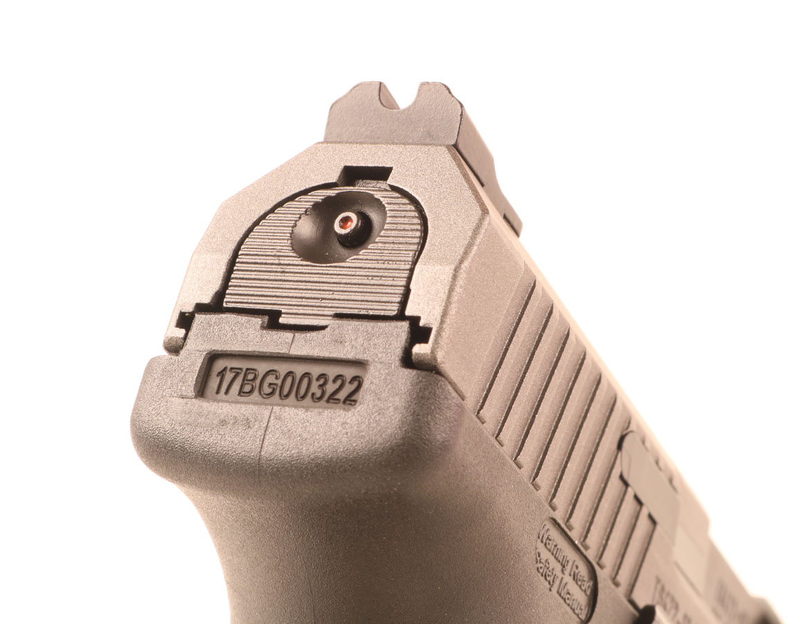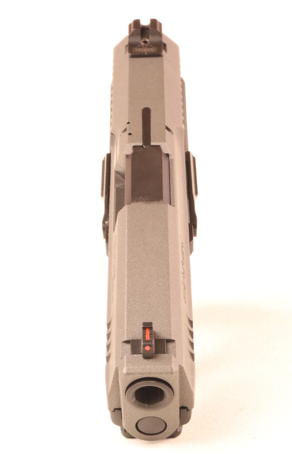 The TP9SF Elite-S pistol sports a 4.19-inch cold hammer-forged barrel formed out of 32CrMoV12-10 steel rated for +P loads. The magazine accepts fifteen-rounds. The firing pin protrudes slightly from the rear of the slide to indicate the state of the striker.