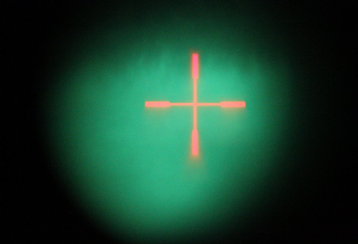 It was hard to get a good picture through the Yukon, but here is what the reticle looks like. During full bright sunlight it is hard to make out, but it holds zero perfectly.