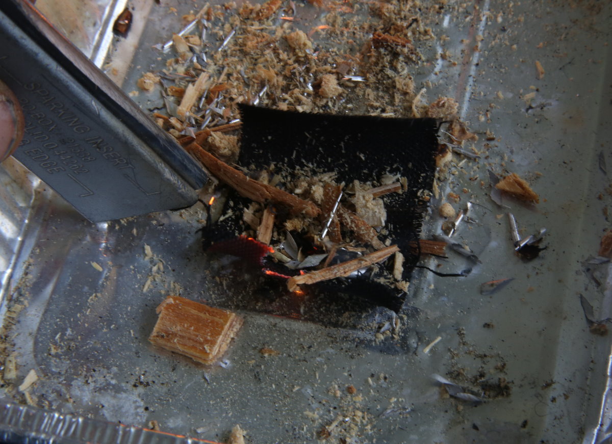 This was a mixture of the Fatwood Dust and Shavings, and some Magnesium silvers thrown in. You can see the side of the tray got discolored from the sparks, and it never did light.
