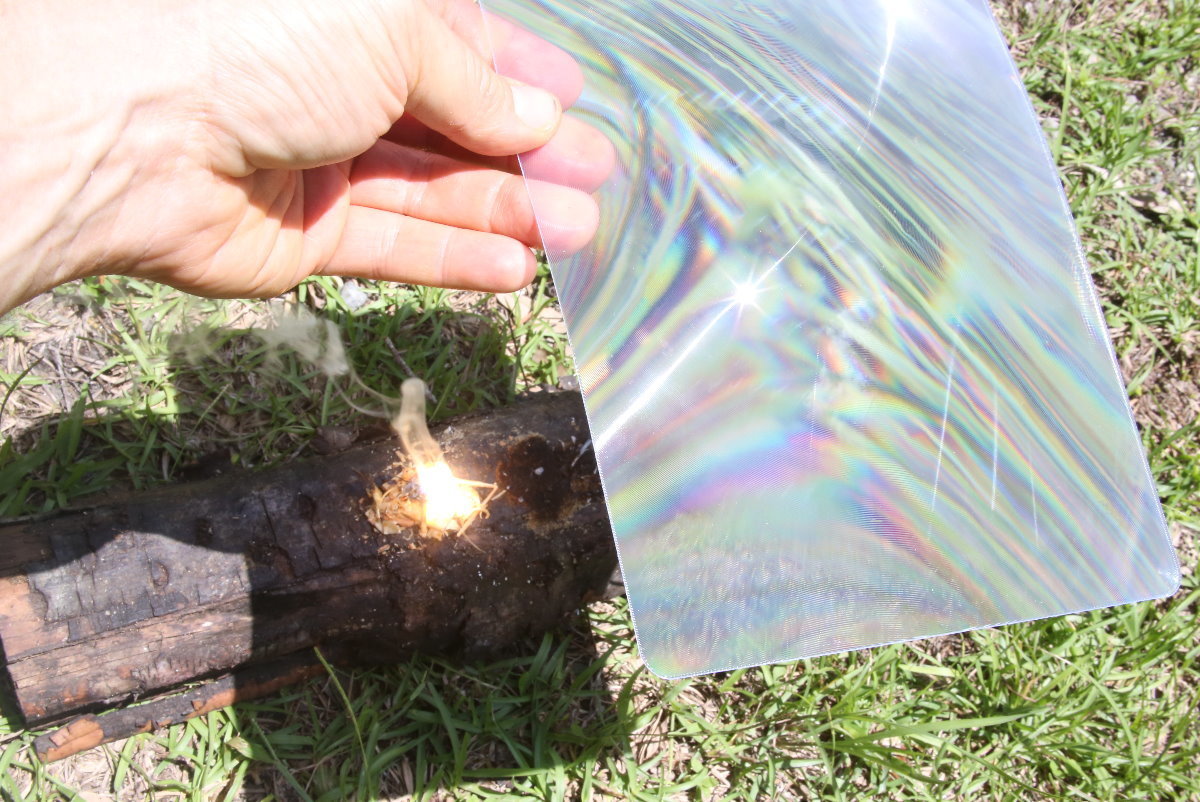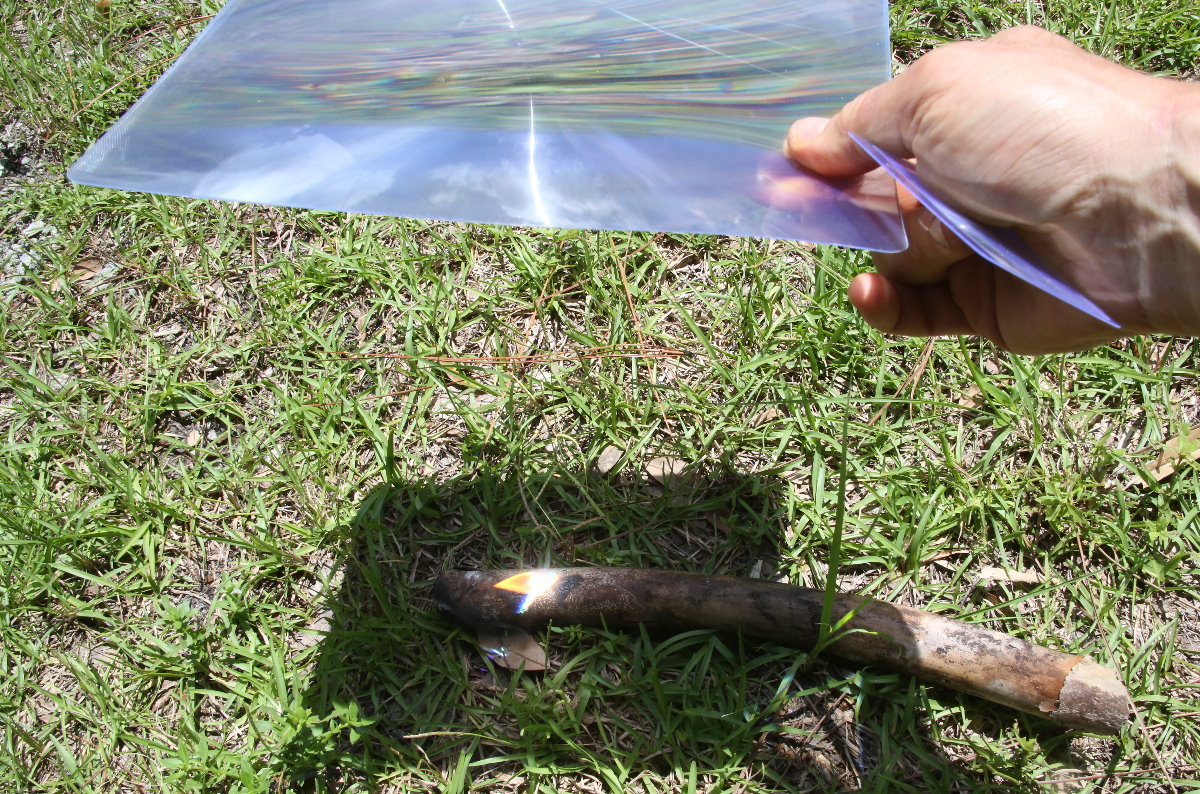 The 2 x 4 was a dud. In bright South Florida sun it did no more than smoke the Fatwood dust and shavings. Then I tried the 7 x 10, and OMG, it’s like a Light Saber. You can get a 5 pack of the large Fresnel Lens Magnifier for $21.46 on Ebay. I don’t suggest that anyone rely on these things, but check out the pictures. I even lit a regular stick off the ground into open flame in like 2 seconds. Go buy some! They won’t work when they are heaving spraying the Solar Radiation Management geoengineering trails, but hey, free fire when you can grab it is free fire. They totally rock so try them where you live.